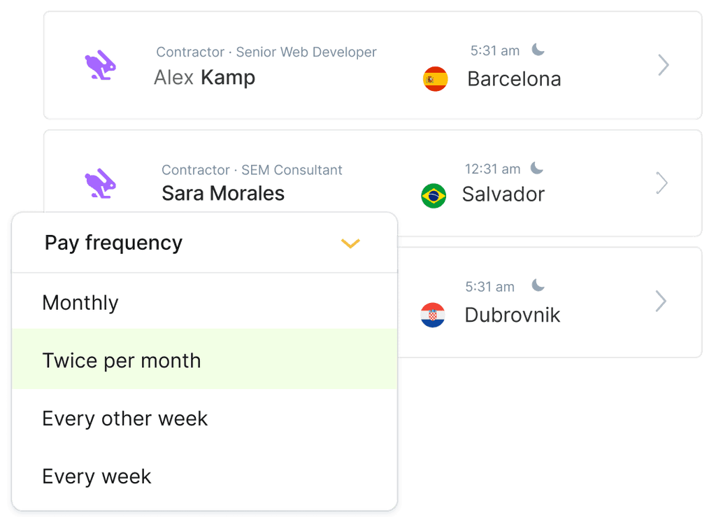 Would your contractor prefer to be paid in local currency or USD? We know preferences vary by currency and country, so we support both options.