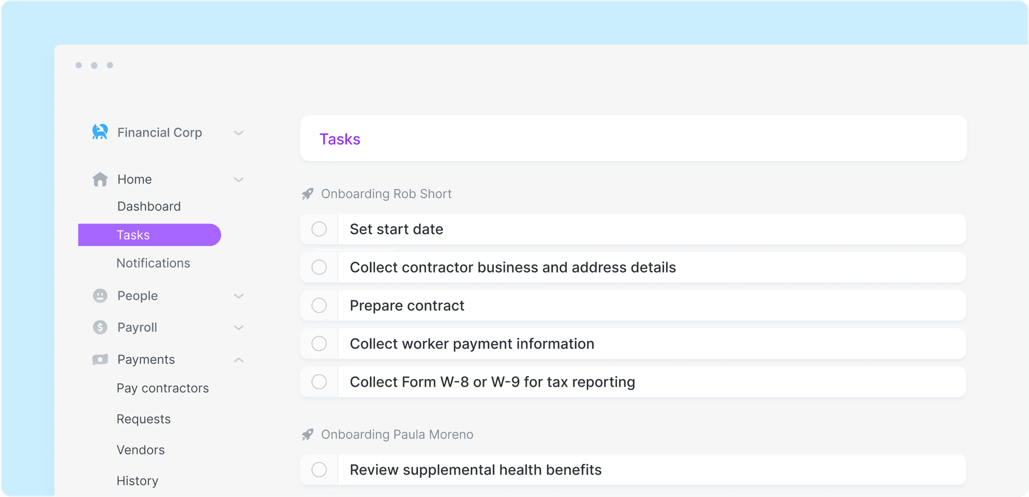 Not sure what to do when hiring in a new country or state? Plane walks you through a clear list of onboarding tasks, so you don’t have to be a local expert.