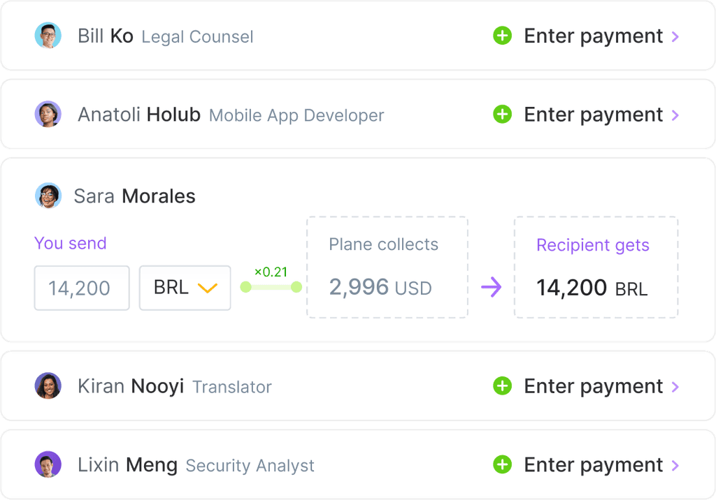 “Plane is the solution I've been wishing for a long time! Plane has achieved the impossible: paying our international team is just as easy as paying our domestic one. Also, the Plane team has been incredibly responsive to all of my requests, no matter how small.”
